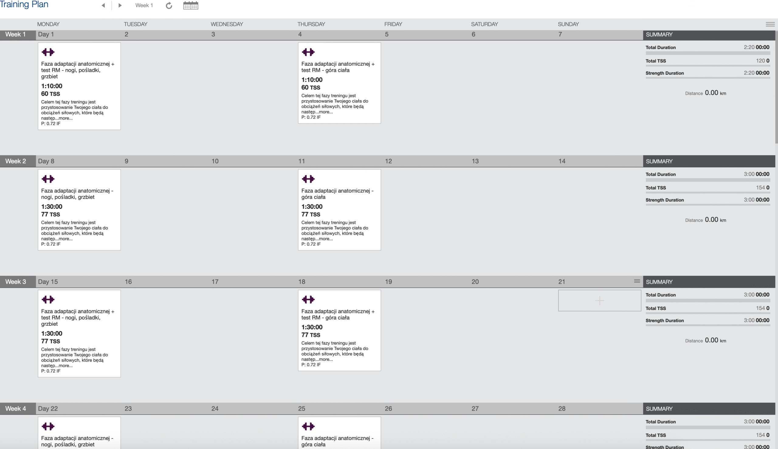 - Wariant 8 tygodni – faza adaptacji anatomicznej + hipertrofii